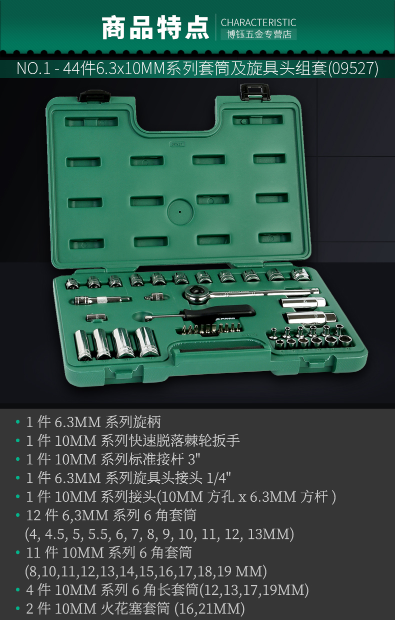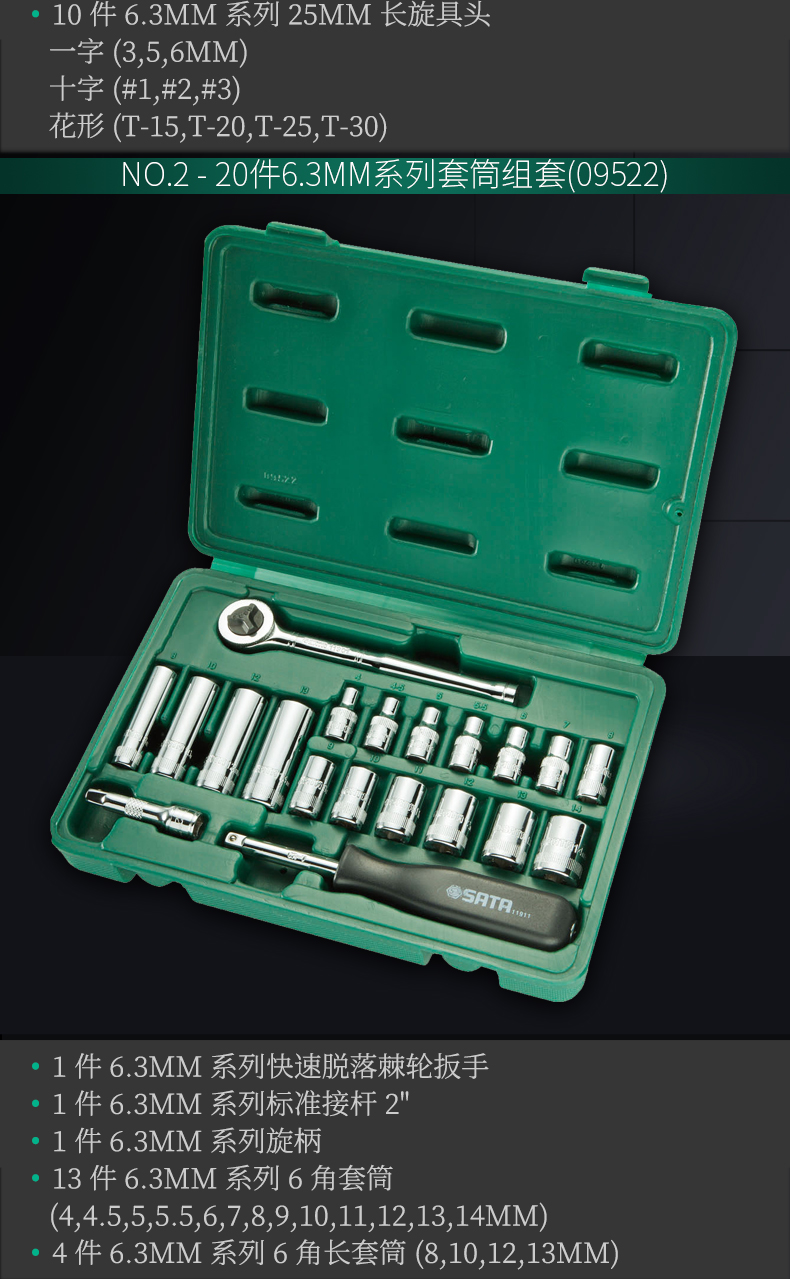 20件6.3MM系列套筒组套(09522),44件6.3x10MM系列套筒及旋具头组套(095,21件10MM系列套筒组套(09524),23件12.5MM系列套筒组套(09526)