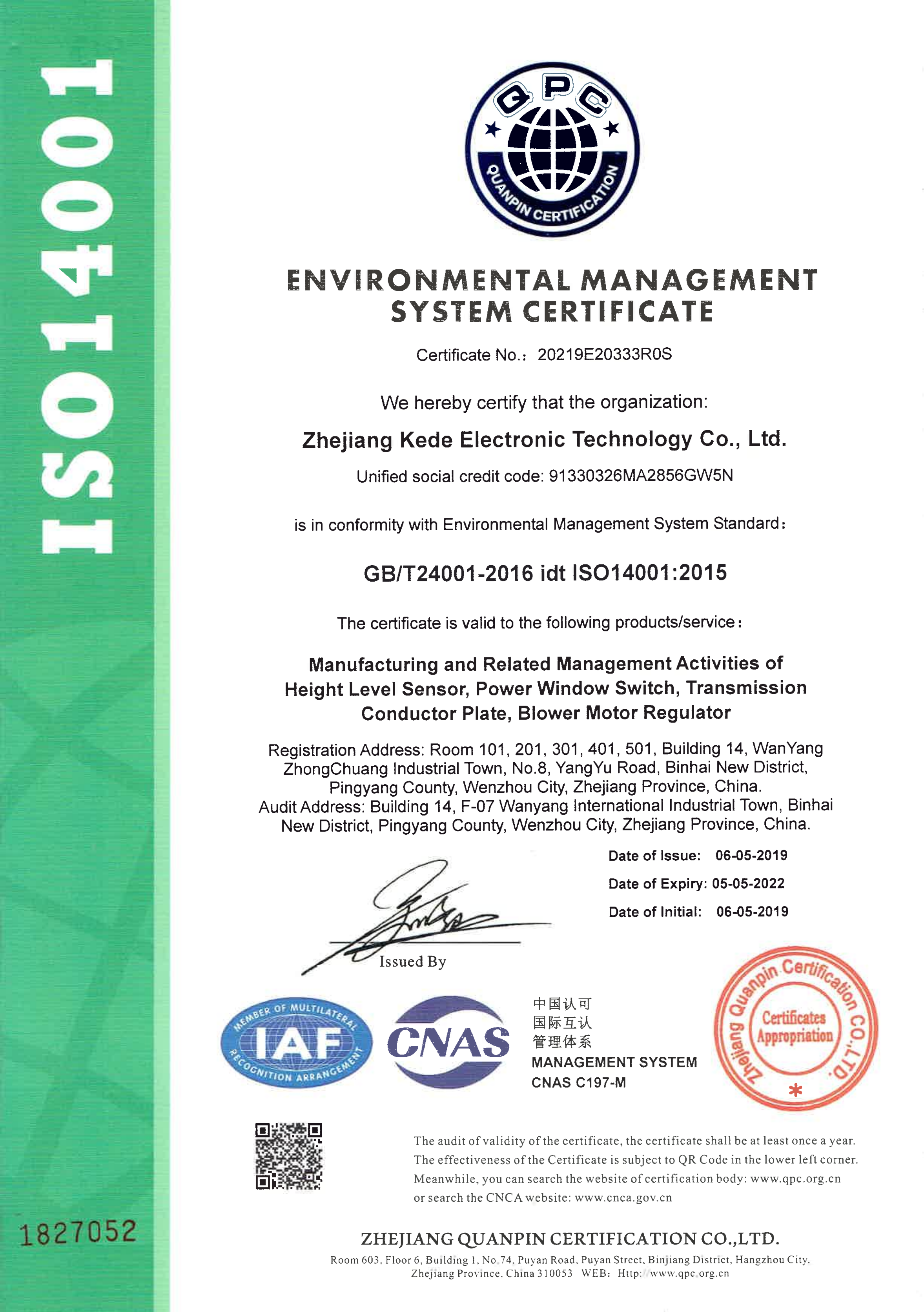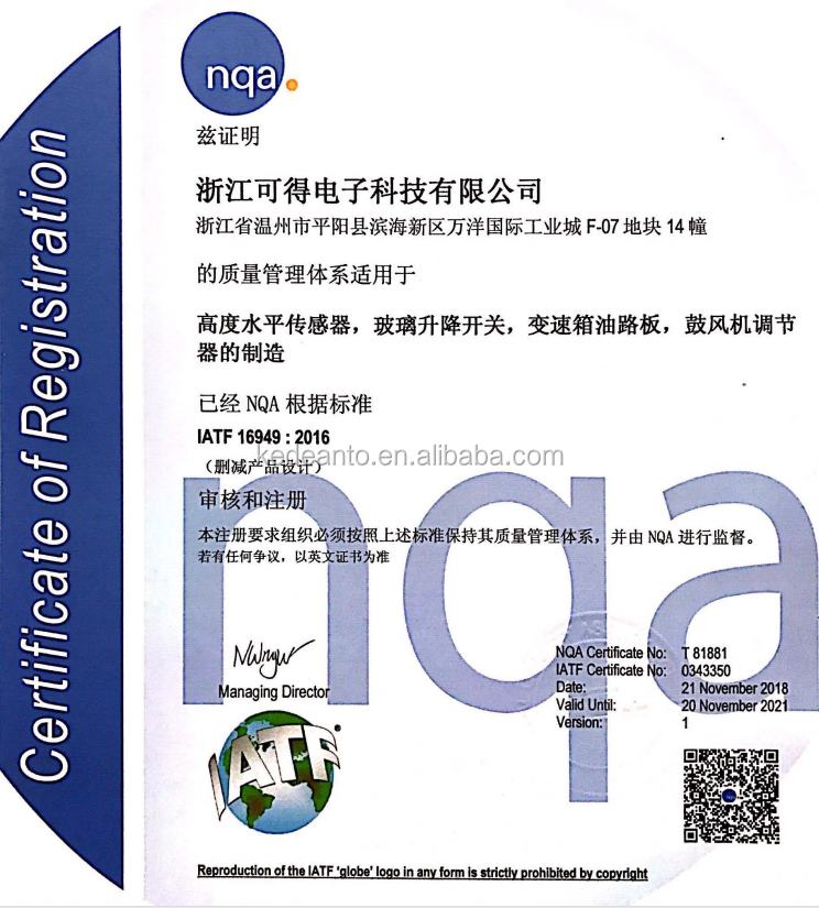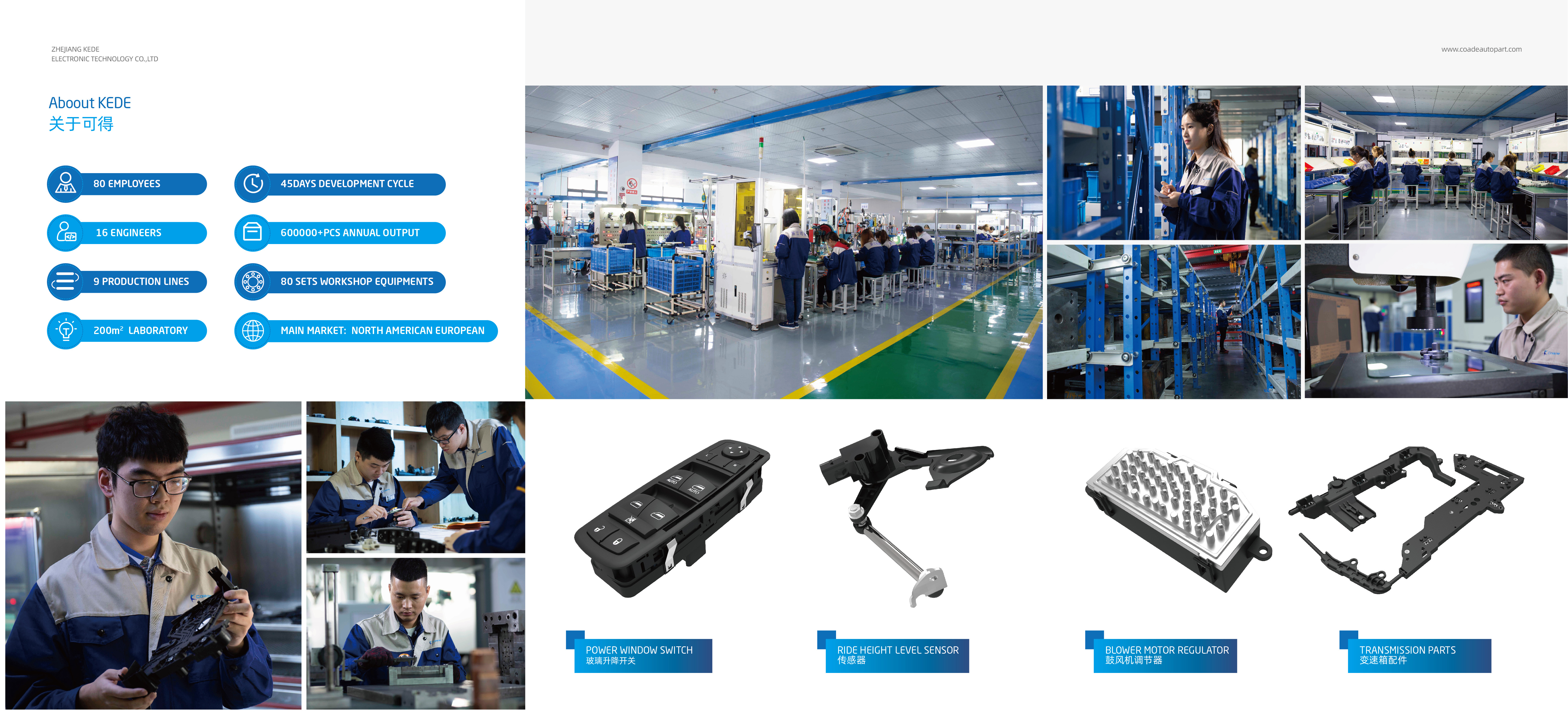 浙江可得电子科技有限公司成立于 2015 年(原瑞安科德 2009~2015),占地面积 4700 多平方米,是一家专业从事汽车零部件研发设计及生产销售的高科技型企业。