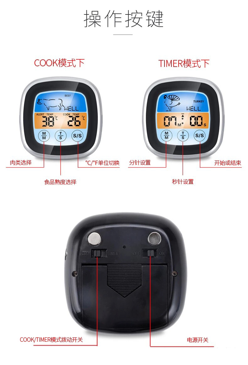 触摸屏电子温度计 计时器烧烤温度计 厨房彩屏食品温度计家用报警