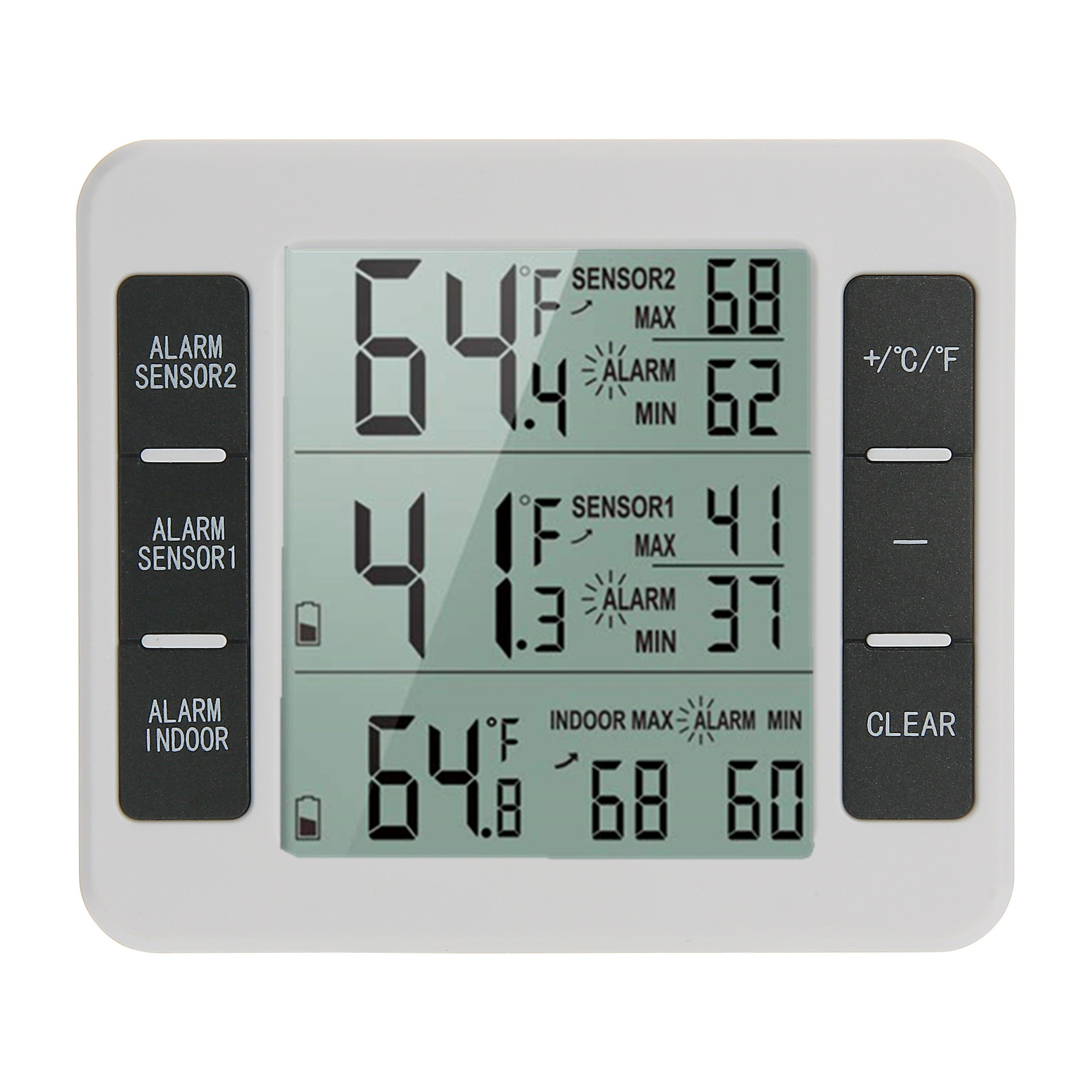 主机和子机都具备的功能有:测量温度 *记忆最小/最大温度值.*高温报警(温度超过预设值将发出声音警报)*低温报警(温度低于预设值将发出声音警报)。