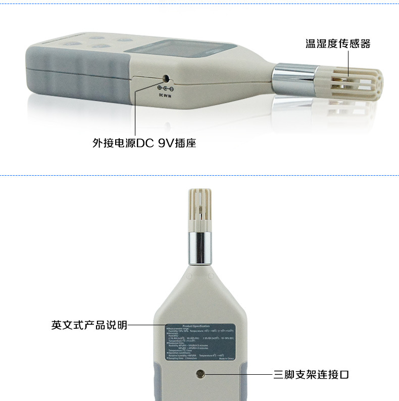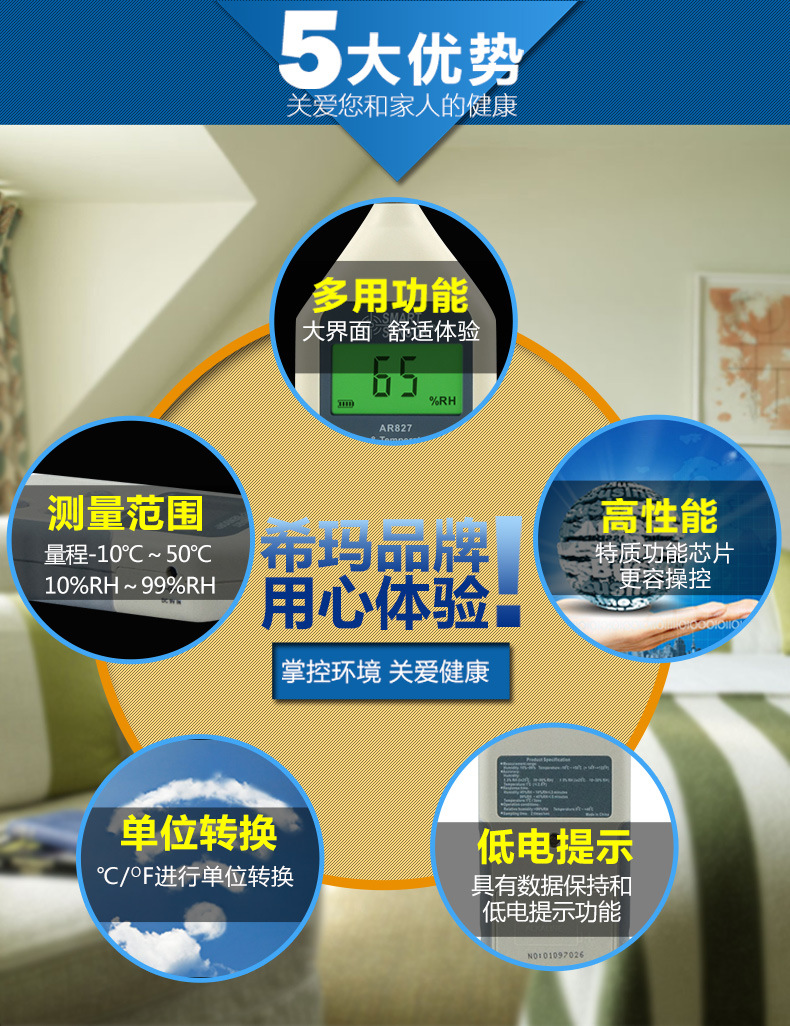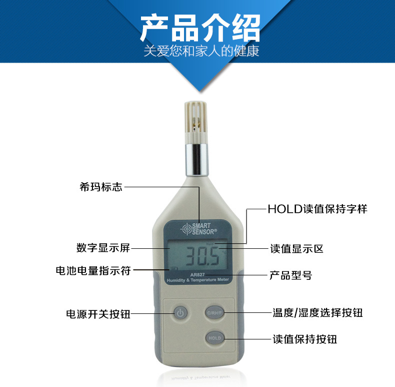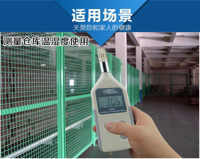 AR827产品特点数字式温湿度计AR827当空气中有很多水气时,我们说空气是潮湿的。科学家经常使用相对湿度来形容空气中水气的多少。简单的说即是想象空气是一条毛巾。如果你倒泻了一杯水,你能用一条毛巾吸收水。但其实毛巾其实可以吸收比一杯更多的水。或许他可以吸收五至十杯的水。水中有的水气的数量只是空气中能够拥有的水气的一部分,因此相对湿度是一百分比。当相对湿度是百分之一百时,空气是饱和的。好像一条尽湿的毛巾一样,空气能不再拿水分。