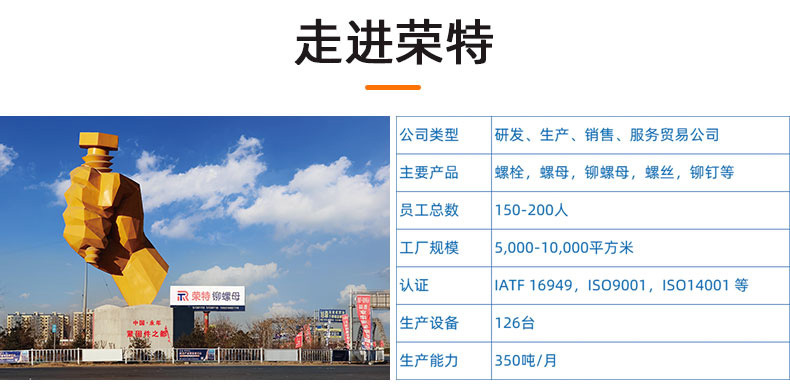河北荣特紧固件制造有限公司,是一家专业从事紧固件、螺丝、螺母等产品研发、生产、销售、服务为一体的专业制造商。公司位于中国紧固件之都河北邯郸,是中国紧固件集散地之一,产业集中,优势明显。我公司工作技术人员经验丰富,对质量我们要求精益求精,对客户我们是以最真诚的服务来赢得客户的信赖。