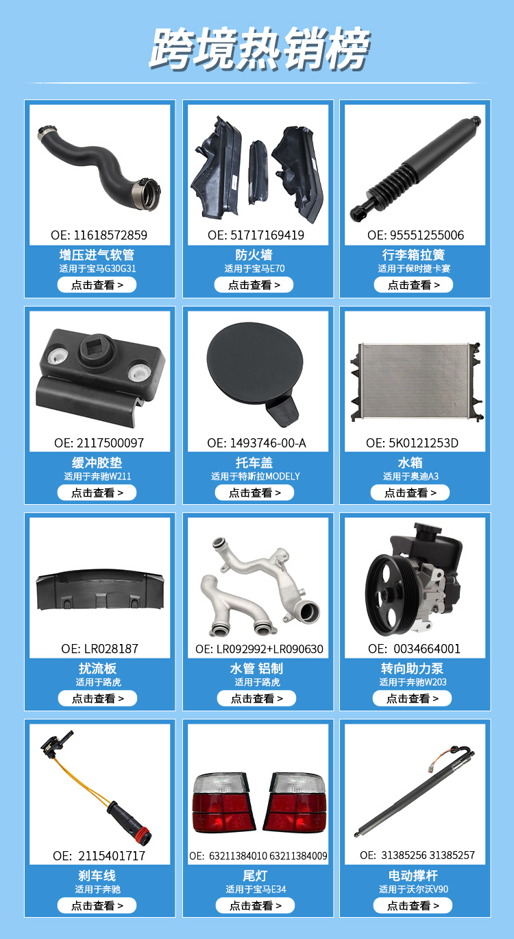 我们的核心产品主要专注于欧美车系零部件,广泛应用于各品牌的汽车(包括奔驰、宝马、路虎捷豹 保时捷),欢迎各界朋友洽谈指导。