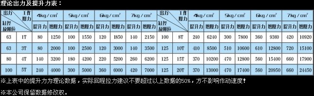 2、上表中的缸径及出力表表中的出力值系指工作气压为6kg/cm2时的出力吨位值。