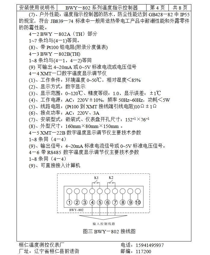 (6)、户外性能:温度指示控制器的防水,防尘性能达到GB428—82中IP55的规定,符合JB839—74标准中一般用途热带电工产品中耐潮性能和外露零件的防霉性能。