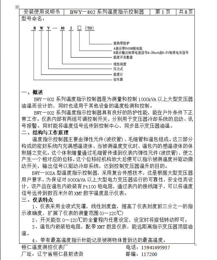 BWY—802系列温度指示控制器是为测量和控制1000kVA以上大型变压器油温而设计的,同时也适用于其他设备的温度检测和控制。