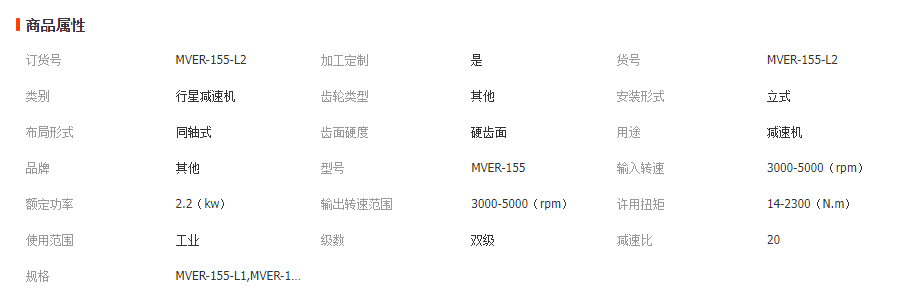v 行星减速器内部齿轮采用20CrMnTi渗碳淬火和磨齿具有体积小、重量轻,承载能力高,使用寿命长、运转平稳,噪声低、输出扭矩大,速比大、效率高、性能安全的特点。兼具功率分流、多齿啮合独用的特性。是一种具有广泛通用性的新型减速机。最大输入功率可达104kW。适用于起重运输、工程机械、冶金、矿山、石油化工、建筑机械、轻工纺织、医疗器械、仪器仪表、汽车、船舶、兵器和航空航天等工业部门行星系列新品种WGN定轴传动减速器、WN子母齿轮传动减速器、弹性均载少齿差减速器。