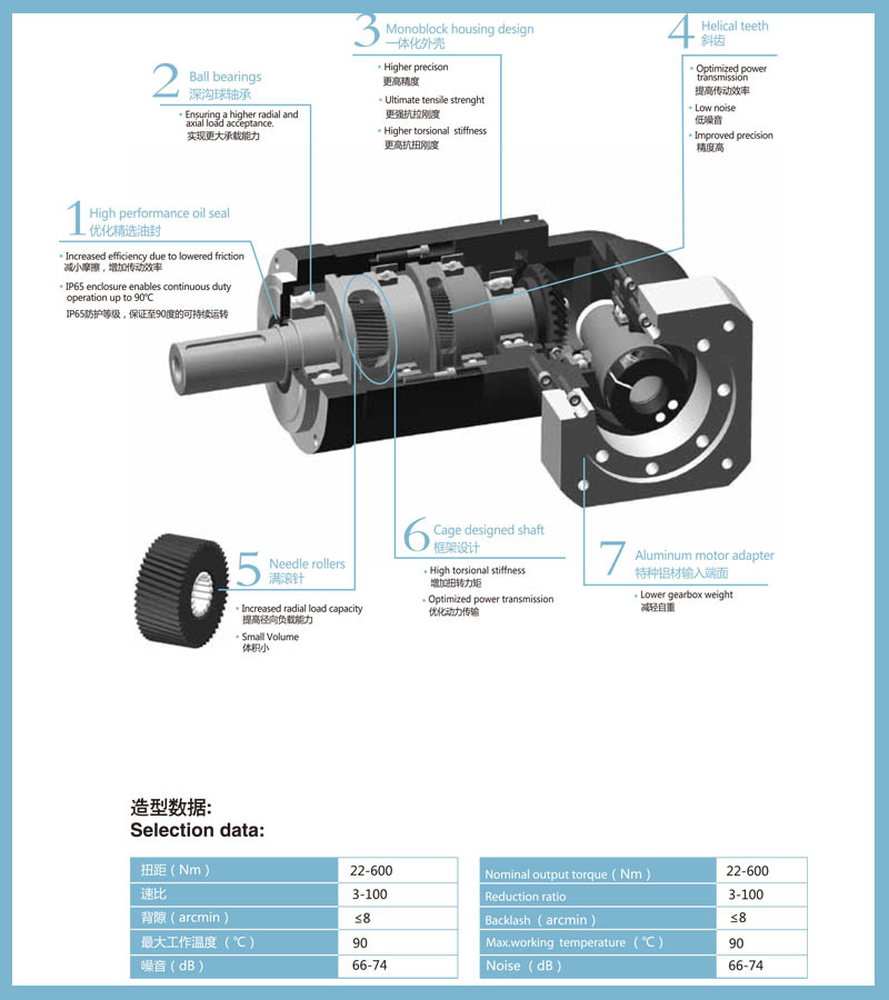 v 相对其他减速机,行星减速机具有高刚性,高精度(单级可做到1分以内),高传动效率(单级在97%-98%),高的 扭矩/体积比,终身免维护等特点.