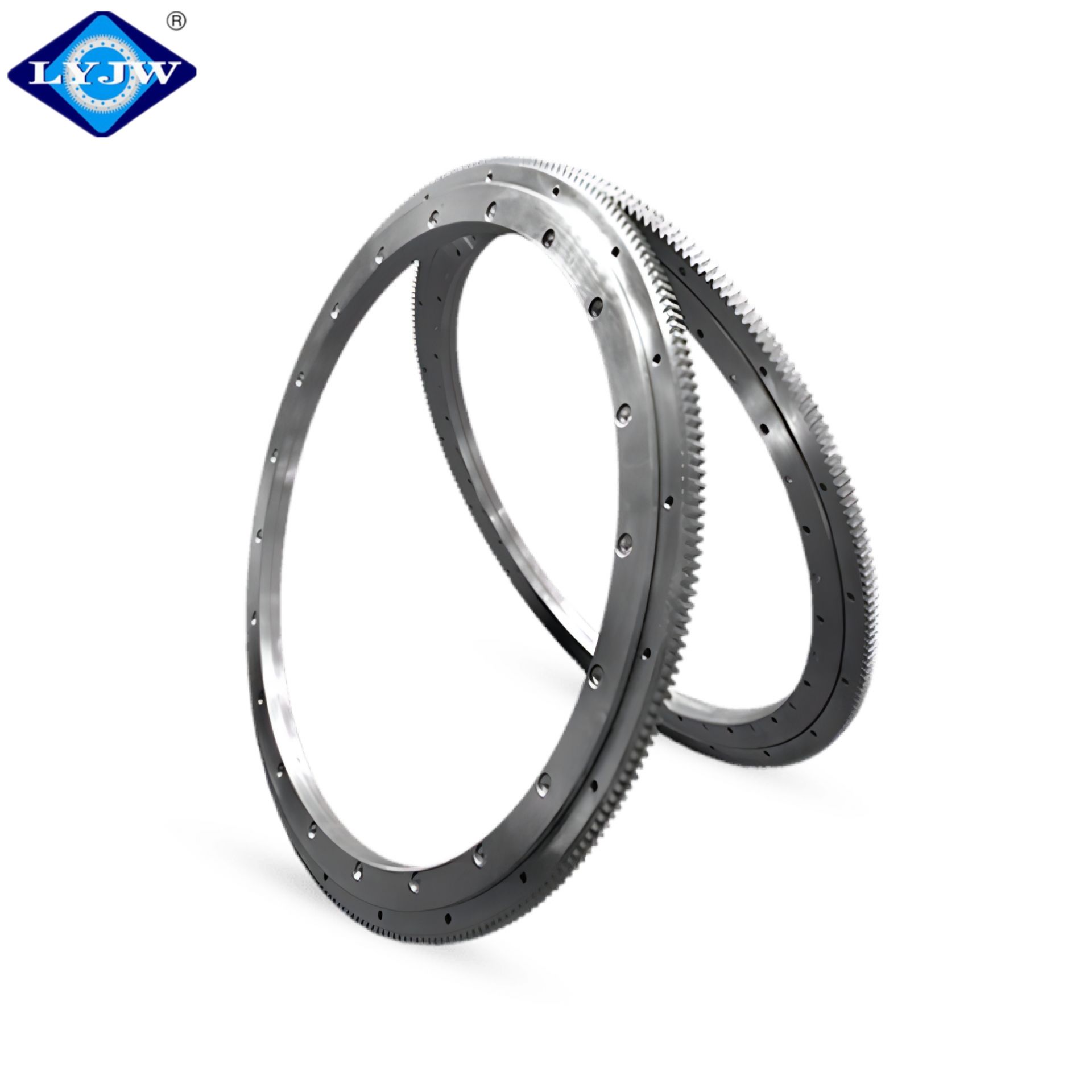 轻型回转支承主要包括外滚圈、内滚圈、加油杯、钢球密封带、隔离块、堵塞 和锥度销, 其特征是: 内滚圈与外滚圈截面均为L 型;在外滚圈的下端面装有加油杯。其特点是:单圈较薄,旋转灵活,可轻松转动。