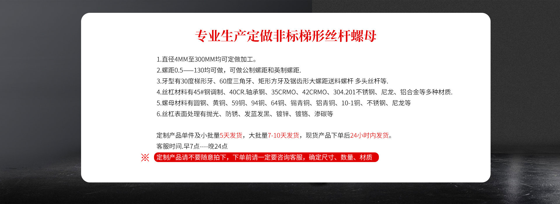 产品规格定做T型丝杆套装,来图来样加工定做,40cr 45号刚材质,304 316 材质,左右旋一体丝杆,往复丝杆,送料螺杆