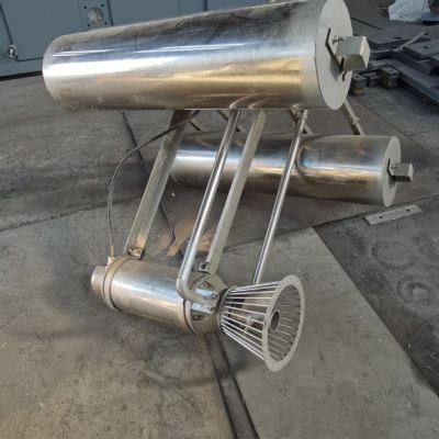 5、潜水式流曝气机采用优质的SUS304 不锈钢制造,完全耐各种腐蚀性水体。推流曝气机由专用电动机、叶轮、浮筒、浮筒底座、吸气室、吸气管、专用保护开关等组成。产品结构紧凑、高性能、低损耗、重量轻、安装简单、操作方便,射流喷气角度可跟据需要来调整,可向上下自由调节60 度(适合各种池底),工作区域的水体深度不得浅于0.50 米(自然底)。