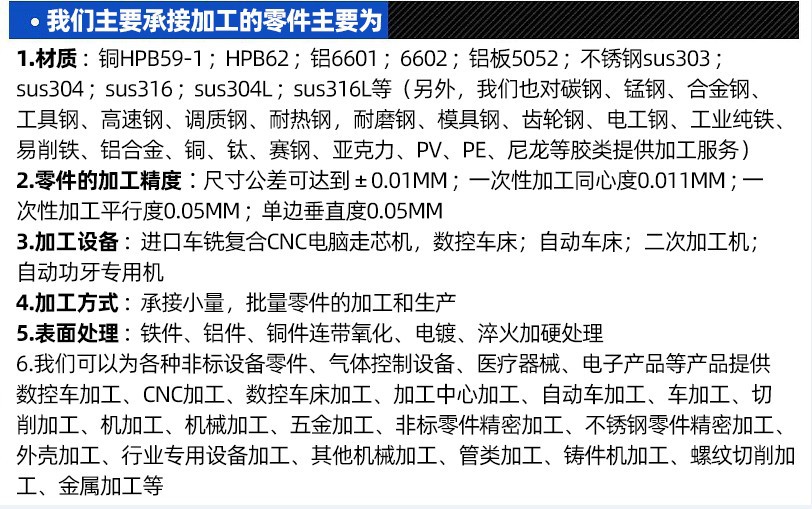 为满足不同客户的需求,可根据客户提供的图纸或样品加工。公司生产产品有五金配件、自动车床加工、数控车床加工、CNC加工、插销车床件、铜螺母、铁螺母、铝螺母、不