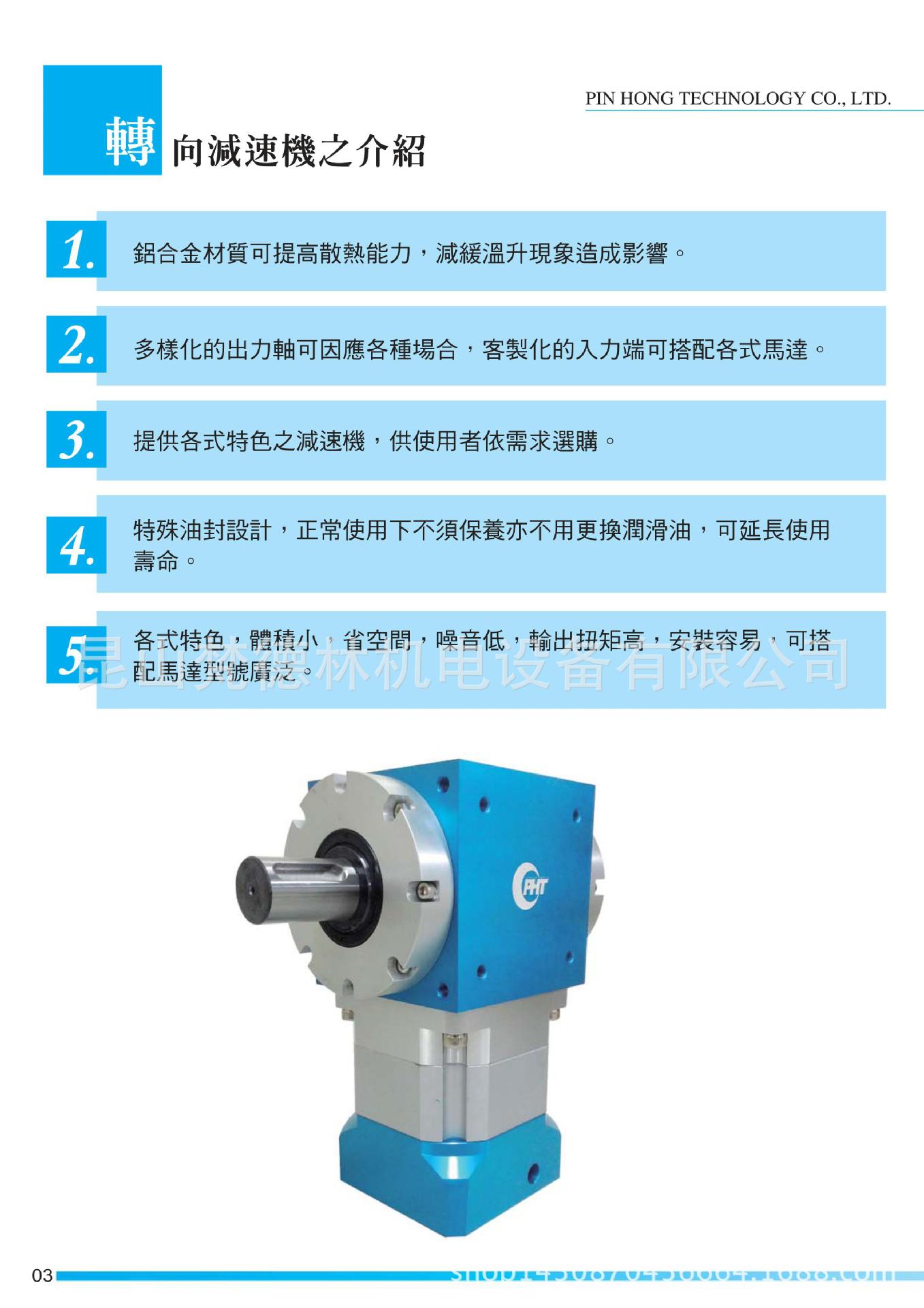 品宏科技行星減速機通過美國ROHS認證,品宏科技有限公司原為“株式會社才クラ"之台灣專業製造廠,1984年精密工具機件生產公司,以高精度及不斷研發的精神,創造 P.H.T. 高品質、高效率和合理價位的伺服專用減速機,為客戶創造优惠的利潤,提供機械自動化業者超高品質的動力傳輸產品,提昇貴公司設備的產能和附加價值,已達更大的商業契機,這是品宏科技有限公司,服務、精密、不斷創新之原则。