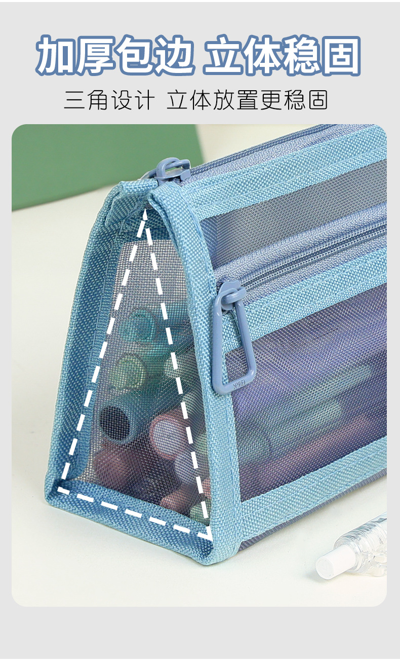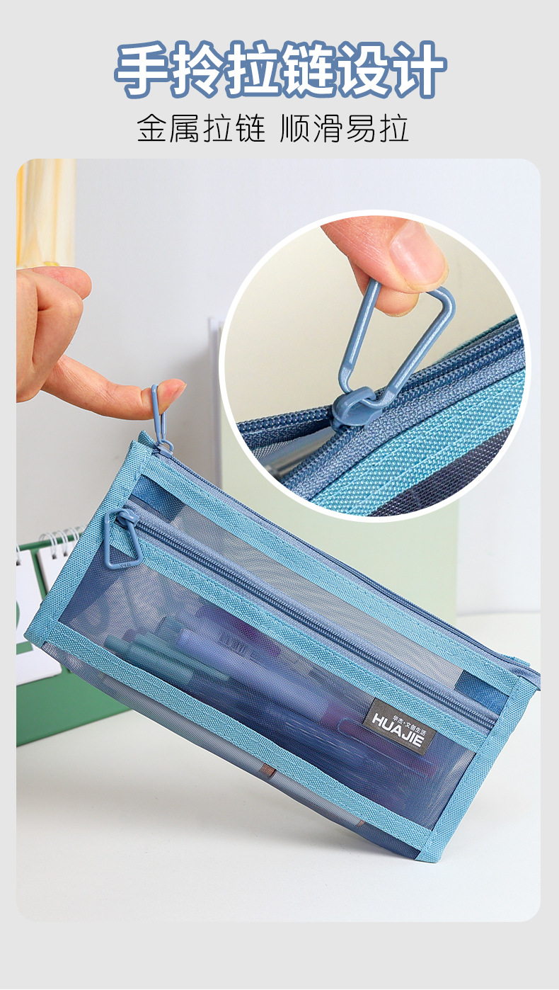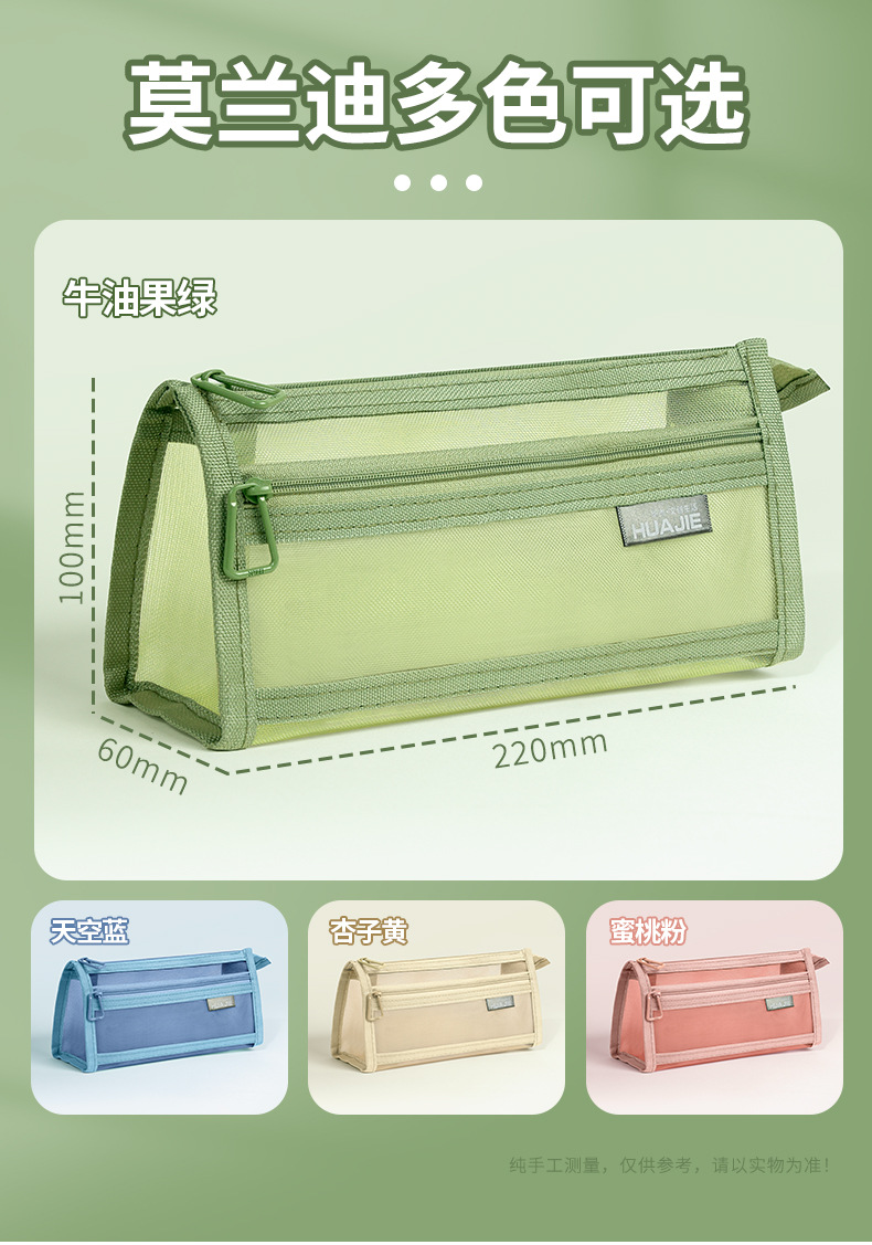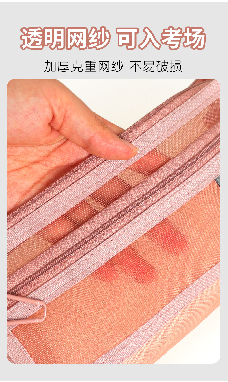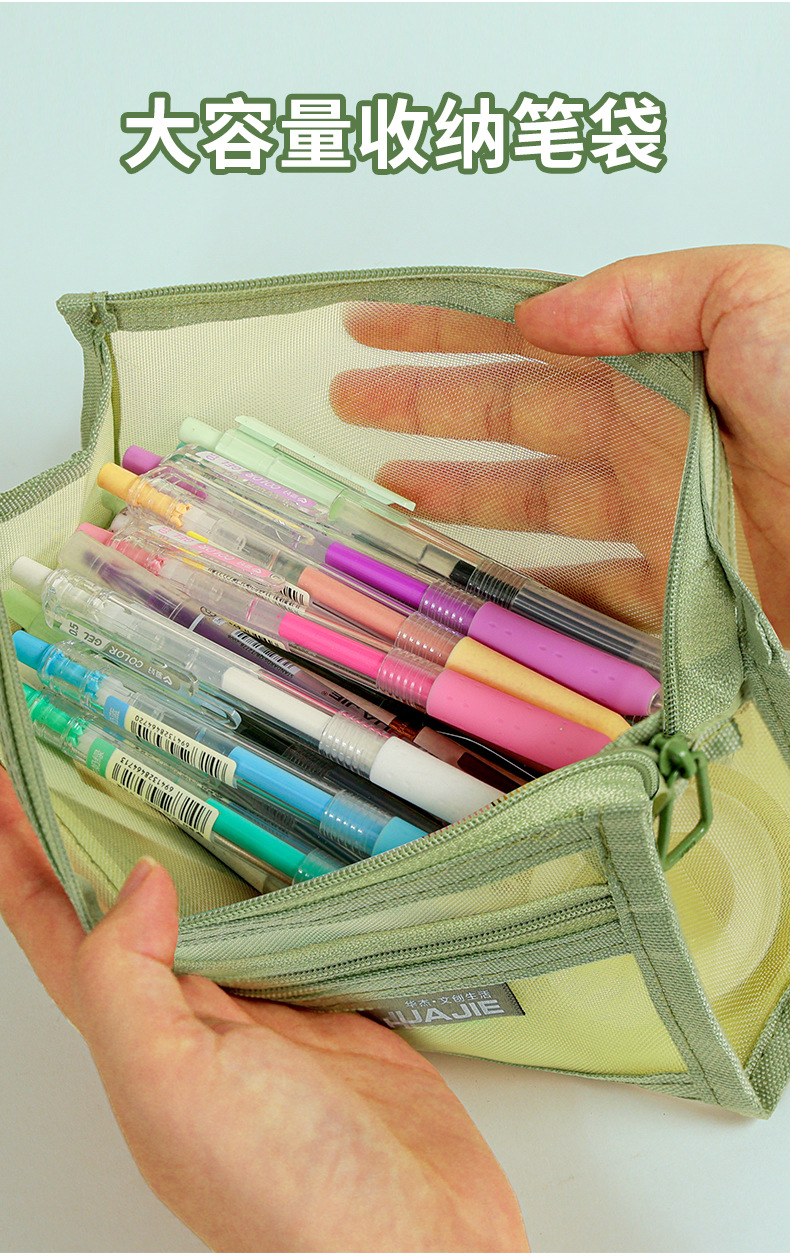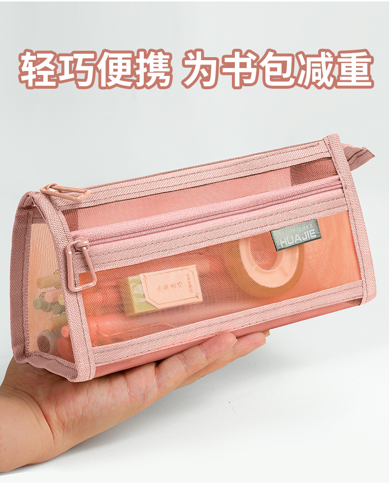 华杰厂家批发莫兰迪色网纱笔袋双层收纳袋化妆包透明笔盒可入考场
