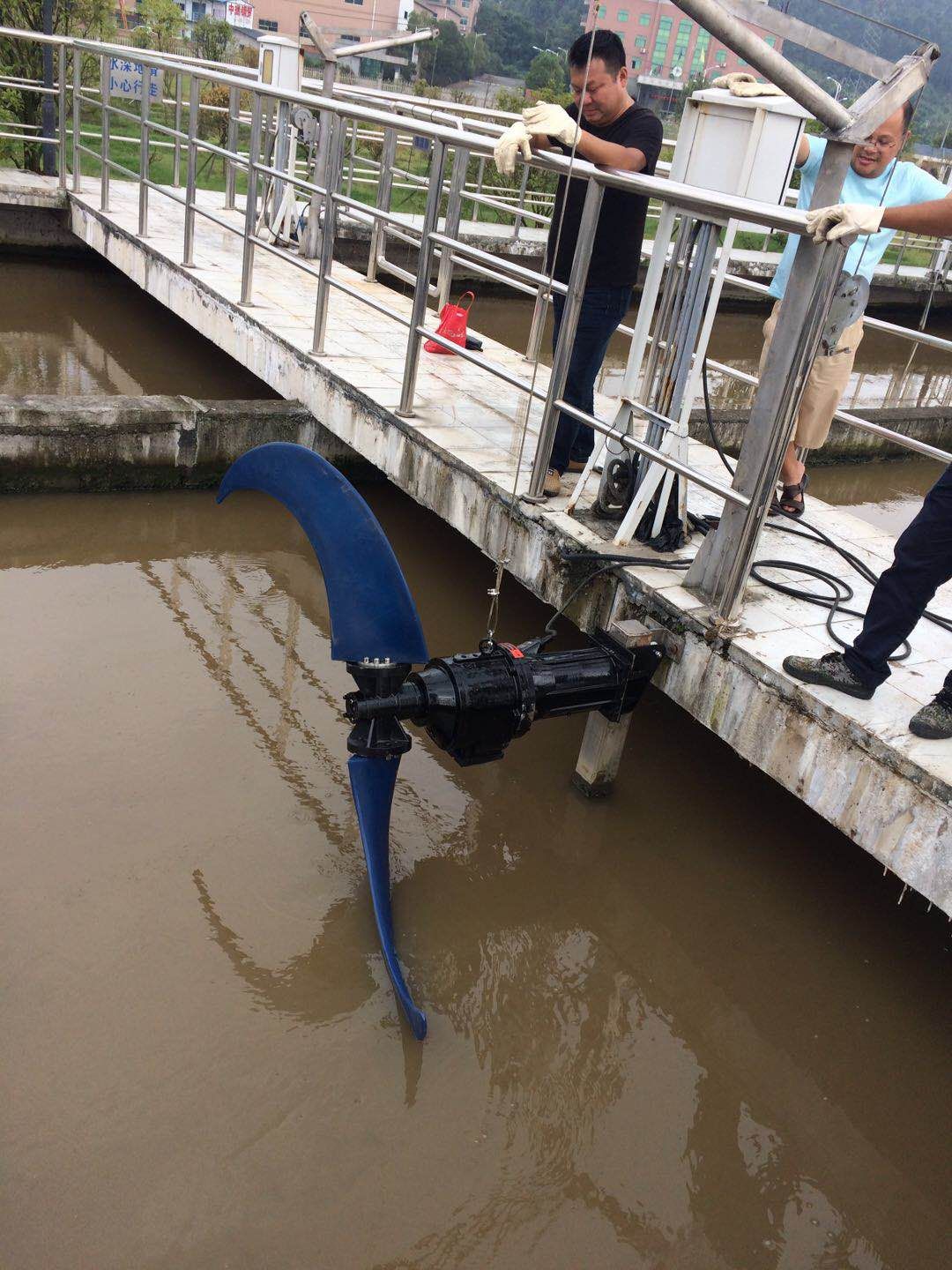 在试运转正常后,切断电源。将搅拌机沿方型导杆放入水下,并确保低速推流器安装到位。接通电源进行运转,并检查是否正常。