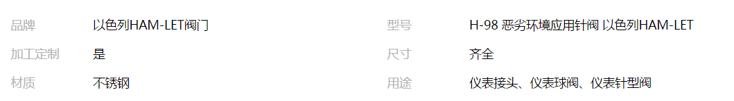 本网页所展示的有关【H-98 恶劣环境应用针阀 以色列HAM-LET_其它阀门_上海霞口阀门机械有限公司】的信息/图片/参数等由全球零部件网的会员【上海霞口阀门机械有限公司】提供,由全球零部件网会员【上海霞口阀门机械有限公司】自行对信息/图片/参数等的真实性、准确性和合法性负责,本平台(本网站)仅提供展示服务,请谨慎交易,因交易而产生的法律关系及法律纠纷由您自行协商解决,本平台(本网站)对此不承担任何责任。您在本网页可以浏览【H-98 恶劣环境应用针阀 以色列HAM-LET_其它阀门_上海霞口阀门机械有限公司】有关的信息/图片/价格等及提供【H-98 恶劣环境应用针阀 以色列HAM-LET_其它阀门_上海霞口阀门机械有限公司】的商家公司简介、联系方式等信息。