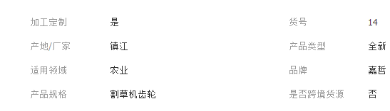 本网页所展示的有关【现货批发供应植保机械配件-割草机齿轮 多规格可选 量大优惠_农业机械 _镇江新区嘉哲汽车零部件制造厂】的信息/图片/参数等由全球零部件网的会员【镇江新区嘉哲汽车零部件制造厂】提供,由全球零部件网会员【镇江新区嘉哲汽车零部件制造厂】自行对信息/图片/参数等的真实性、准确性和合法性负责,本平台(本网站)仅提供展示服务,请谨慎交易,因交易而产生的法律关系及法律纠纷由您自行协商解决,本平台(本网站)对此不承担任何责任。您在本网页可以浏览【现货批发供应植保机械配件-割草机齿轮 多规格可选 量大优惠_农业机械 _镇江新区嘉哲汽车零部件制造厂】有关的信息/图片/价格等及提供【现货批发供应植保机械配件-割草机齿轮 多规格可选 量大优惠_农业机械 _镇江新区嘉哲汽车零部件制造厂】的商家公司简介、联系方式等信息。