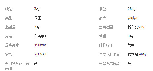 本网页所展示的有关【快速举升3吨用气囊千斤顶_ HVAC汽车_沧州亚奇亚汽车配件有限公司】的信息/图片/参数等由全球零部件网的会员【沧州亚奇亚汽车配件有限公司】提供,由全球零部件网会员【沧州亚奇亚汽车配件有限公司】自行对信息/图片/参数等的真实性、准确性和合法性负责,本平台(本网站)仅提供展示服务,请谨慎交易,因交易而产生的法律关系及法律纠纷由您自行协商解决,本平台(本网站)对此不承担任何责任。您在本网页可以浏览【快速举升3吨用气囊千斤顶_ HVAC汽车_沧州亚奇亚汽车配件有限公司】有关的信息/图片/价格等及提供【快速举升3吨用气囊千斤顶_ HVAC汽车_沧州亚奇亚汽车配件有限公司】的商家公司简介、联系方式等信息。