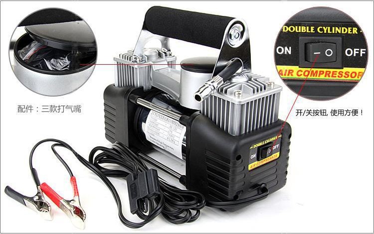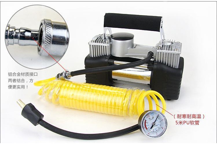 注意:双缸充气泵是采用汽车电瓶供电,不能插点烟器,双缸功率大,打气快!不要嫌麻烦,毕竟这是应急的工具,没气的几率并不大,稍微麻烦那一回是可以忽略不计的!