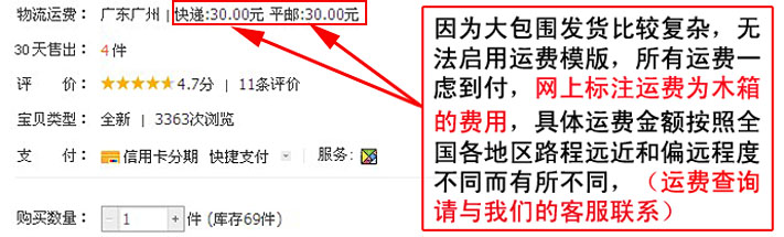 物流或者快递的运费默认都是到付,买家提货时直接给物流公司。由于包围体积大,发货时我们建议使用物流发货。运费由买家按实际到付,货到当地货运站后通知买家自提货。发货快慢以发货单日期为准,我们只是委托物流公司代运,他们时间我们无法控制,也可以买家指定物流,我们都会协助跟进。不便之处,敬请谅解。