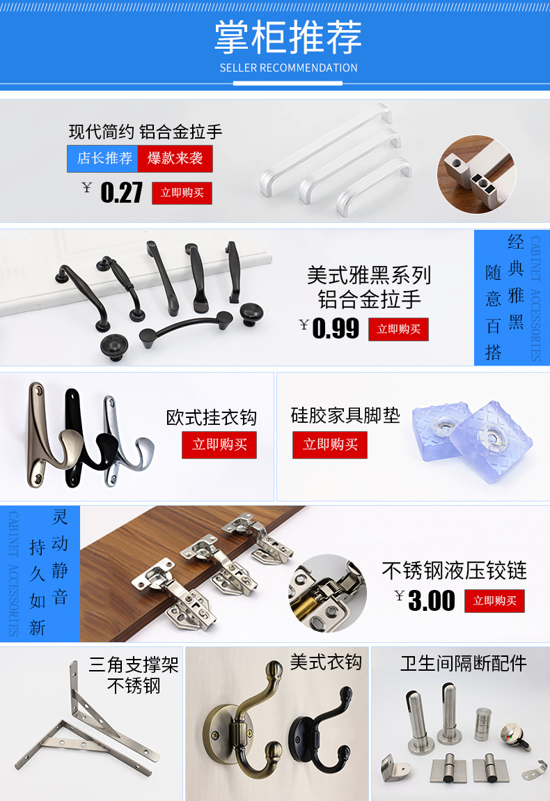 拉手衣钩系列 橱柜五金系列 衣柜配件系列 办公配件系列 卫生隔断系列 浴室配件系列 榻榻米升降机 其他五金配件