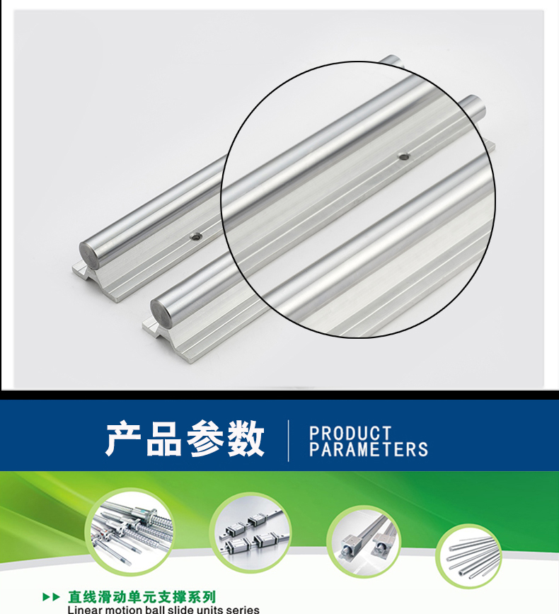 导轨材质:光轴45#高碳钢、表面镀铬、淬火硬轴 铝托导轨