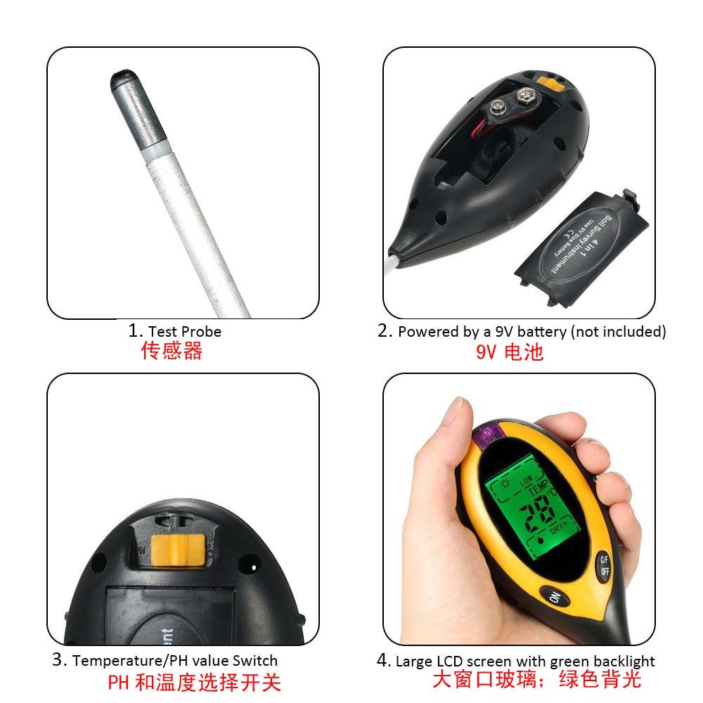 快乐的土壤意味着快乐的植物!因此,提取有价值的土壤信息是成功园艺的重要组成部分。手上有一个土壤测试器不仅可以帮助你知道土壤中的什么,而且还需要添加什么来给它正确的pH值。我们的4合1土壤仪将提供快速准确的信息!如果你喜欢园艺,你知道施肥对你的植物有多么重要,这样它们就可以茁壮成长。但是,你真的知道你的植物需要什么养分吗?当设计和种植你的花园时,你需要知道土壤是酸性的还是碱性的,因为不同的植物在不同的土壤中茁壮成长。土壤pH值是描述土壤酸碱性的数字。7的pH被认为是中性的,酸性土壤的pH值低于7,如果高于7,土壤是碱性的。什么是我们的选择?在1台仪器数字测试器中测量最重要的统计数据,更容易读取LCD显示器8英寸探头的测量结果,快速、准确地测量便携式和轻便。这里我们的产品特点:材料:塑料+铝合金精度:1℃/ 1℃工作温度:5℃。~(40)℃土壤温度测量范围:- 9~50℃(16~122℃)土壤pH测量范围:3.5-5.0电源:1×9V电池(不包括)探头长度:19.7cm/7.76的项目尺寸:31.8×6.2*3.6cm/12.52×2.44×1.42