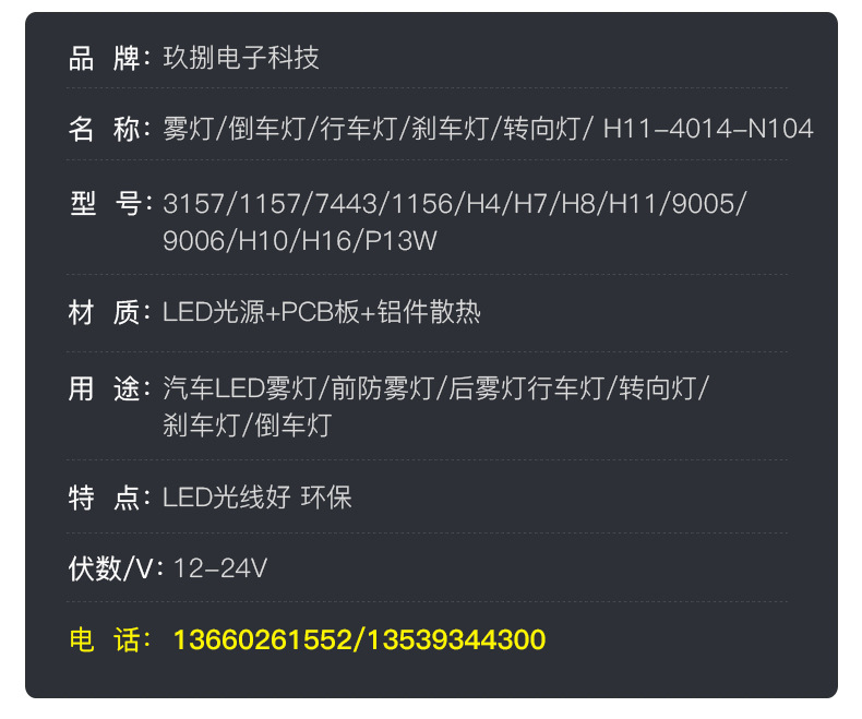 本网页所展示的有关【1156-4014-104灯 转向灯 刹车灯行车灯改装 尾灯雾灯跨境专供_汽车灯具_佛山市玖捌电子科技有限公司】的信息/图片/参数等由全球零部件网的会员【佛山市玖捌电子科技有限公司】提供,由全球零部件网会员【佛山市玖捌电子科技有限公司】自行对信息/图片/参数等的真实性、准确性和合法性负责,本平台(本网站)仅提供展示服务,请谨慎交易,因交易而产生的法律关系及法律纠纷由您自行协商解决,本平台(本网站)对此不承担任何责任。您在本网页可以浏览【1156-4014-104灯 转向灯 刹车灯行车灯改装 尾灯雾灯跨境专供_汽车灯具_佛山市玖捌电子科技有限公司】有关的信息/图片/价格等及提供【1156-4014-104灯 转向灯 刹车灯行车灯改装 尾灯雾灯跨境专供_汽车灯具_佛山市玖捌电子科技有限公司】的商家公司简介、联系方式等信息。