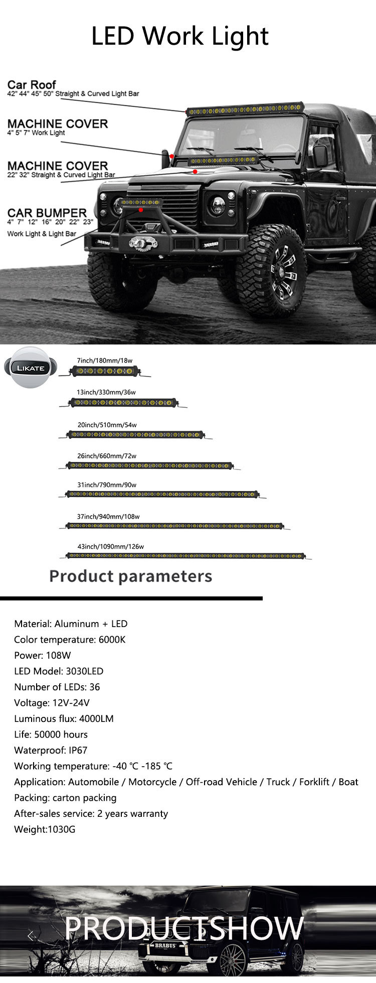 本网页所展示的有关【厂家直销新款汽车led工作灯 单排108w36smd长条越野车顶检修射灯_汽车灯具_广州利卡特电子科技有限公司】的信息/图片/参数等由全球零部件网的会员【广州利卡特电子科技有限公司】提供,由全球零部件网会员【广州利卡特电子科技有限公司】自行对信息/图片/参数等的真实性、准确性和合法性负责,本平台(本网站)仅提供展示服务,请谨慎交易,因交易而产生的法律关系及法律纠纷由您自行协商解决,本平台(本网站)对此不承担任何责任。您在本网页可以浏览【厂家直销新款汽车led工作灯 单排108w36smd长条越野车顶检修射灯_汽车灯具_广州利卡特电子科技有限公司】有关的信息/图片/价格等及提供【厂家直销新款汽车led工作灯 单排108w36smd长条越野车顶检修射灯_汽车灯具_广州利卡特电子科技有限公司】的商家公司简介、联系方式等信息。