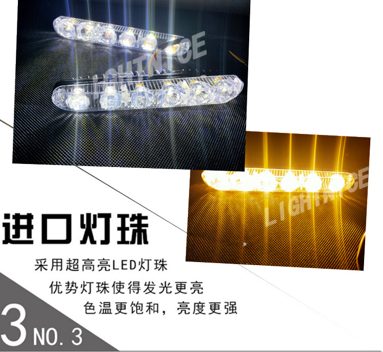 规格6灯白光(一对),9灯白光(一对),6灯白+黄(常亮一对),9灯白+黄(常亮一对),6灯白+黄光跑马流光一对,9灯白+黄光跑马流光一对