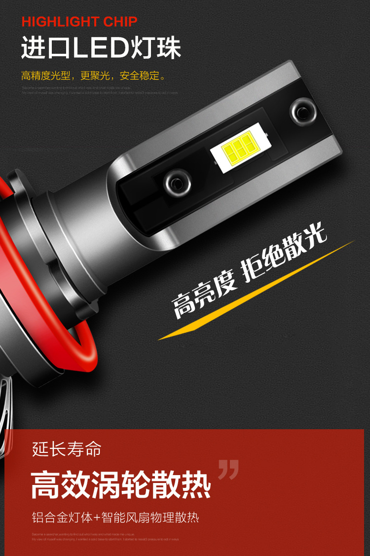 4.寿命长:采用铝合金灯体+10000转高速静音风扇双重物理散热,有效降低灯体温度,延长大灯使用寿命。