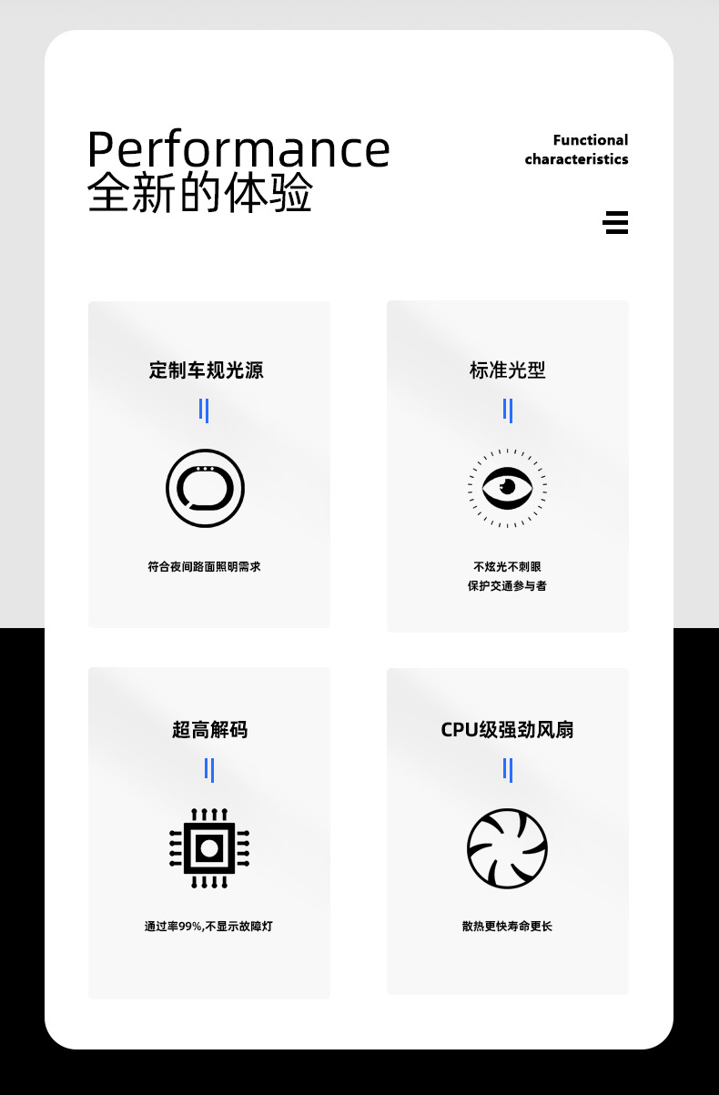 1二面360度发光,配合原车灯杯反射,提升光利用率,瞬间启动。特殊材质,解决高温散热问题。
