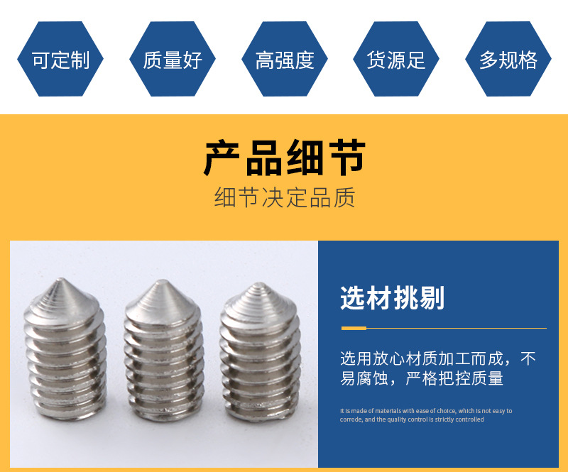 本网页所展示的有关【厂家批发无头螺丝机米止付紧钉 内六角紧定GB78碳钢螺钉 量大从优_紧固件&五金件_瑞安市金智紧固件有限公司】的信息/图片/参数等由全球零部件网的会员【瑞安市金智紧固件有限公司】提供,由全球零部件网会员【瑞安市金智紧固件有限公司】自行对信息/图片/参数等的真实性、准确性和合法性负责,本平台(本网站)仅提供展示服务,请谨慎交易,因交易而产生的法律关系及法律纠纷由您自行协商解决,本平台(本网站)对此不承担任何责任。您在本网页可以浏览【厂家批发无头螺丝机米止付紧钉 内六角紧定GB78碳钢螺钉 量大从优_紧固件&五金件_瑞安市金智紧固件有限公司】有关的信息/图片/价格等及提供【厂家批发无头螺丝机米止付紧钉 内六角紧定GB78碳钢螺钉 量大从优_紧固件&五金件_瑞安市金智紧固件有限公司】的商家公司简介、联系方式等信息。
