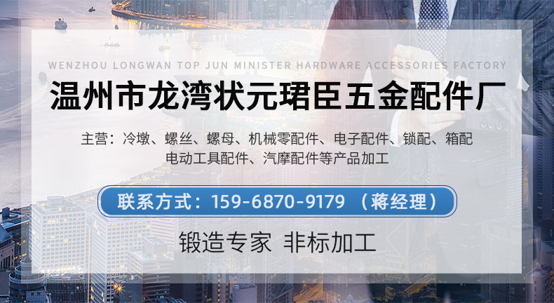 本网页所展示的有关【多工位冷镦_非标螺丝螺母_冷墩毛胚件_各种高精密度五金配件_冲压件_温州龙湾状元珺臣五金配件厂】的信息/图片/参数等由全球零部件网的会员【温州龙湾状元珺臣五金配件厂】提供,由全球零部件网会员【温州龙湾状元珺臣五金配件厂】自行对信息/图片/参数等的真实性、准确性和合法性负责,本平台(本网站)仅提供展示服务,请谨慎交易,因交易而产生的法律关系及法律纠纷由您自行协商解决,本平台(本网站)对此不承担任何责任。您在本网页可以浏览【多工位冷镦_非标螺丝螺母_冷墩毛胚件_各种高精密度五金配件_冲压件_温州龙湾状元珺臣五金配件厂】有关的信息/图片/价格等及提供【多工位冷镦_非标螺丝螺母_冷墩毛胚件_各种高精密度五金配件_冲压件_温州龙湾状元珺臣五金配件厂】的商家公司简介、联系方式等信息。