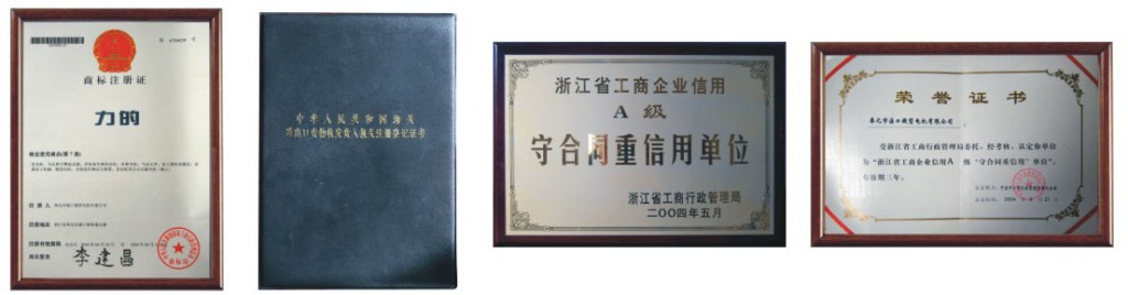 企业曾经被工商行政部门评为浙江省“守合同重信用单位”。2010年初,我司申请注册的“力的”商标正式通过了国家商标管理部门审核,并投入使用。我们必将用更好的产品和服务,努力在行业内塑造一个有影响力的新品牌,实现企业更高的发展目标。