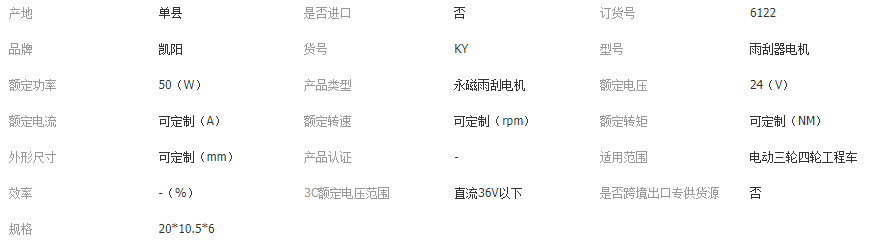 本网页所展示的有关【五线全铜电机工程车12V 24V雨刮电机永磁刮水电机驾驶楼雨刮电机_雨刷系统_单县凯阳电机制造厂】的信息/图片/参数等由全球零部件网的会员【单县凯阳电机制造厂】提供,由全球零部件网会员【单县凯阳电机制造厂】自行对信息/图片/参数等的真实性、准确性和合法性负责,本平台(本网站)仅提供展示服务,请谨慎交易,因交易而产生的法律关系及法律纠纷由您自行协商解决,本平台(本网站)对此不承担任何责任。您在本网页可以浏览【五线全铜电机工程车12V 24V雨刮电机永磁刮水电机驾驶楼雨刮电机_雨刷系统_单县凯阳电机制造厂】有关的信息/图片/价格等及提供【五线全铜电机工程车12V 24V雨刮电机永磁刮水电机驾驶楼雨刮电机_雨刷系统_单县凯阳电机制造厂】的商家公司简介、联系方式等信息。