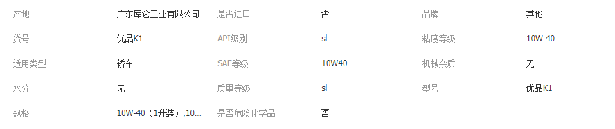 本网页所展示的有关【库仑优品K1合成机油老车专用特级抗磨SL级6000公里发动机润滑油_润滑油_广东中海南联能源有限公司惠州分公司】的信息/图片/参数等由全球零部件网的会员【广东中海南联能源有限公司惠州分公司】提供,由全球零部件网会员【广东中海南联能源有限公司惠州分公司】自行对信息/图片/参数等的真实性、准确性和合法性负责,本平台(本网站)仅提供展示服务,请谨慎交易,因交易而产生的法律关系及法律纠纷由您自行协商解决,本平台(本网站)对此不承担任何责任。您在本网页可以浏览【库仑优品K1合成机油老车专用特级抗磨SL级6000公里发动机润滑油_润滑油_广东中海南联能源有限公司惠州分公司】有关的信息/图片/价格等及提供【库仑优品K1合成机油老车专用特级抗磨SL级6000公里发动机润滑油_润滑油_广东中海南联能源有限公司惠州分公司】的商家公司简介、联系方式等信息。
