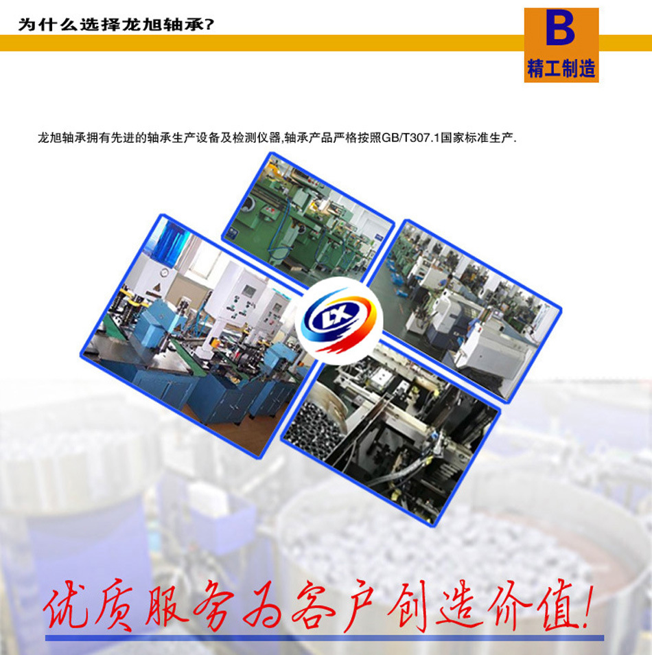东莞市龙旭轴承有限公司是一家集生产与贸易为一体,专业生产经营内径1—60mm的微型、中小型轴承的综合型企业,主营产品包括公制及英制的深沟球轴承、不锈钢轴承、法兰盘轴承、钟表轴承、滚针轴承、单向轴承、平面推力球轴承等多类产品,广泛用于高档电动玩具、仪器仪表、食品机械、渔具、马达、微型电机、汽车电机、健身运动器材、医疗器械、电脑散热风扇、计算机、精密仪器、机械设备、家用电器、办公设备制造行业,并且还可根据客户的不同要求订制各种特殊轴承,以满足客户个性化的需求。