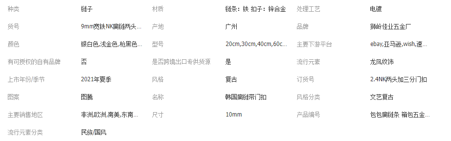细一号8mm宽NK铁链两头不加扣,按米卖。链接:https://detail.1688.com/offer/1108706413.html