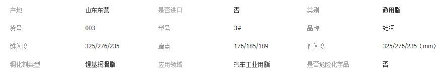本网页所展示的有关【润滑脂 工程机械用脂 锂基脂 黄油桶装 润滑脂厂家_润滑油_东营领润石化有限公司】的信息/图片/参数等由全球零部件网的会员【东营领润石化有限公司】提供,由全球零部件网会员【东营领润石化有限公司】自行对信息/图片/参数等的真实性、准确性和合法性负责,本平台(本网站)仅提供展示服务,请谨慎交易,因交易而产生的法律关系及法律纠纷由您自行协商解决,本平台(本网站)对此不承担任何责任。您在本网页可以浏览【润滑脂 工程机械用脂 锂基脂 黄油桶装 润滑脂厂家_润滑油_东营领润石化有限公司】有关的信息/图片/价格等及提供【润滑脂 工程机械用脂 锂基脂 黄油桶装 润滑脂厂家_润滑油_东营领润石化有限公司】的商家公司简介、联系方式等信息。