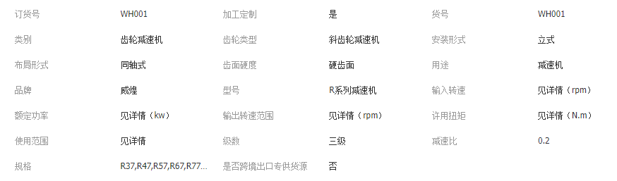 本网页所展示的有关【R系列斜齿轮 低噪音卧式硬齿面减速机 调速变速箱减速器R27-R167_减速器_浙江威煌减速机有限公司】的信息/图片/参数等由全球零部件网的会员【浙江威煌减速机有限公司】提供,由全球零部件网会员【浙江威煌减速机有限公司】自行对信息/图片/参数等的真实性、准确性和合法性负责,本平台(本网站)仅提供展示服务,请谨慎交易,因交易而产生的法律关系及法律纠纷由您自行协商解决,本平台(本网站)对此不承担任何责任。您在本网页可以浏览【R系列斜齿轮 低噪音卧式硬齿面减速机 调速变速箱减速器R27-R167_减速器_浙江威煌减速机有限公司】有关的信息/图片/价格等及提供【R系列斜齿轮 低噪音卧式硬齿面减速机 调速变速箱减速器R27-R167_减速器_浙江威煌减速机有限公司】的商家公司简介、联系方式等信息。