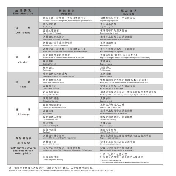 3.使用过程中发生不正常情况时,应及时停机检查,可参照“故障原因及解决办法”表处理。(减速机的油温最高允许达到95℃,在此温度界限下,只要油温不再上升,可以放心使用)。