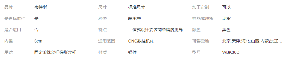 本网页所展示的有关【韦特斯丝杆支撑座 型号WBK30DF 重载轴承座 高负荷座系列_轴承附件_山东韦特斯自动化科技有限公司】的信息/图片/参数等由全球零部件网的会员【山东韦特斯自动化科技有限公司】提供,由全球零部件网会员【山东韦特斯自动化科技有限公司】自行对信息/图片/参数等的真实性、准确性和合法性负责,本平台(本网站)仅提供展示服务,请谨慎交易,因交易而产生的法律关系及法律纠纷由您自行协商解决,本平台(本网站)对此不承担任何责任。您在本网页可以浏览【韦特斯丝杆支撑座 型号WBK30DF 重载轴承座 高负荷座系列_轴承附件_山东韦特斯自动化科技有限公司】有关的信息/图片/价格等及提供【韦特斯丝杆支撑座 型号WBK30DF 重载轴承座 高负荷座系列_轴承附件_山东韦特斯自动化科技有限公司】的商家公司简介、联系方式等信息。