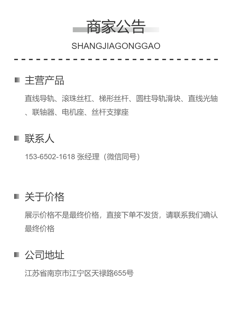 本网页所展示的有关【国产直线导轨滑块15 20 25 30 35 45 55 65四方法兰线性导轨选型_导轨_南京春信自动化设备有限公司】的信息/图片/参数等由全球零部件网的会员【南京春信自动化设备有限公司】提供,由全球零部件网会员【南京春信自动化设备有限公司】自行对信息/图片/参数等的真实性、准确性和合法性负责,本平台(本网站)仅提供展示服务,请谨慎交易,因交易而产生的法律关系及法律纠纷由您自行协商解决,本平台(本网站)对此不承担任何责任。您在本网页可以浏览【国产直线导轨滑块15 20 25 30 35 45 55 65四方法兰线性导轨选型_导轨_南京春信自动化设备有限公司】有关的信息/图片/价格等及提供【国产直线导轨滑块15 20 25 30 35 45 55 65四方法兰线性导轨选型_导轨_南京春信自动化设备有限公司】的商家公司简介、联系方式等信息。
