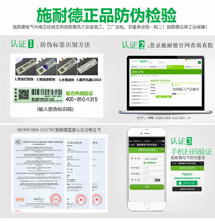 我司出售的施耐德系列产品均为原装正品,支持任何权威机构检测,包括二维码及官方电话4008101315。质保按施耐德官方标准执行。