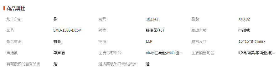 本网页所展示的有关【高分贝1580有源贴片蜂鸣器15*15*8MM直流DC5V环保高温SMD蜂鸣器_蜂鸣器_深圳市兴华鑫电子科技有限公司】的信息/图片/参数等由全球零部件网的会员【深圳市兴华鑫电子科技有限公司】提供,由全球零部件网会员【深圳市兴华鑫电子科技有限公司】自行对信息/图片/参数等的真实性、准确性和合法性负责,本平台(本网站)仅提供展示服务,请谨慎交易,因交易而产生的法律关系及法律纠纷由您自行协商解决,本平台(本网站)对此不承担任何责任。您在本网页可以浏览【高分贝1580有源贴片蜂鸣器15*15*8MM直流DC5V环保高温SMD蜂鸣器_蜂鸣器_深圳市兴华鑫电子科技有限公司】有关的信息/图片/价格等及提供【高分贝1580有源贴片蜂鸣器15*15*8MM直流DC5V环保高温SMD蜂鸣器_蜂鸣器_深圳市兴华鑫电子科技有限公司】的商家公司简介、联系方式等信息。
