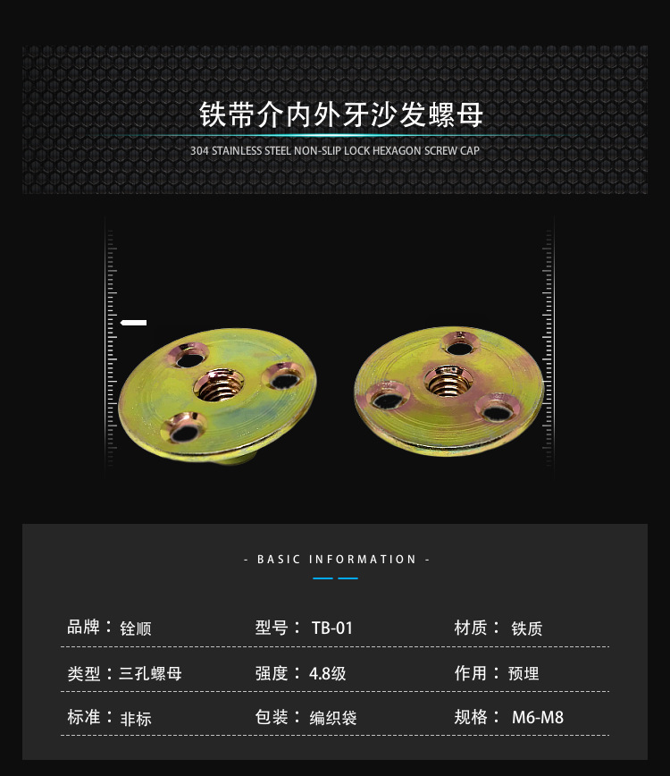 本网页所展示的有关【铁板螺母 工厂直供45#钢镀锌公制m6m8m10家具配件三孔预埋螺母_螺母_东莞市大岭山铨顺五金制品有限公司】的信息/图片/参数等由全球零部件网的会员【东莞市大岭山铨顺五金制品有限公司】提供,由全球零部件网会员【东莞市大岭山铨顺五金制品有限公司】自行对信息/图片/参数等的真实性、准确性和合法性负责,本平台(本网站)仅提供展示服务,请谨慎交易,因交易而产生的法律关系及法律纠纷由您自行协商解决,本平台(本网站)对此不承担任何责任。您在本网页可以浏览【铁板螺母 工厂直供45#钢镀锌公制m6m8m10家具配件三孔预埋螺母_螺母_东莞市大岭山铨顺五金制品有限公司】有关的信息/图片/价格等及提供【铁板螺母 工厂直供45#钢镀锌公制m6m8m10家具配件三孔预埋螺母_螺母_东莞市大岭山铨顺五金制品有限公司】的商家公司简介、联系方式等信息。