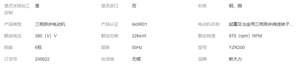本网页所展示的有关【新大力电机YZR200L-6 22KW绕线转子三相冶金起重电机_驱动电机_无锡新大力电机有限公司】的信息/图片/参数等由全球零部件网的会员【无锡新大力电机有限公司】提供,由全球零部件网会员【无锡新大力电机有限公司】自行对信息/图片/参数等的真实性、准确性和合法性负责,本平台(本网站)仅提供展示服务,请谨慎交易,因交易而产生的法律关系及法律纠纷由您自行协商解决,本平台(本网站)对此不承担任何责任。您在本网页可以浏览【新大力电机YZR200L-6 22KW绕线转子三相冶金起重电机_驱动电机_无锡新大力电机有限公司】有关的信息/图片/价格等及提供【新大力电机YZR200L-6 22KW绕线转子三相冶金起重电机_驱动电机_无锡新大力电机有限公司】的商家公司简介、联系方式等信息。