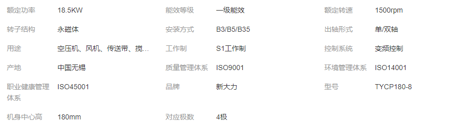 本网页所展示的有关【新大力 一级能效 永磁变频电机 TYCP180-8-18.5KW 4极/1500转_驱动电机_无锡新大力电机有限公司】的信息/图片/参数等由全球零部件网的会员【无锡新大力电机有限公司】提供,由全球零部件网会员【无锡新大力电机有限公司】自行对信息/图片/参数等的真实性、准确性和合法性负责,本平台(本网站)仅提供展示服务,请谨慎交易,因交易而产生的法律关系及法律纠纷由您自行协商解决,本平台(本网站)对此不承担任何责任。您在本网页可以浏览【新大力 一级能效 永磁变频电机 TYCP180-8-18.5KW 4极/1500转_驱动电机_无锡新大力电机有限公司】有关的信息/图片/价格等及提供【新大力 一级能效 永磁变频电机 TYCP180-8-18.5KW 4极/1500转_驱动电机_无锡新大力电机有限公司】的商家公司简介、联系方式等信息。