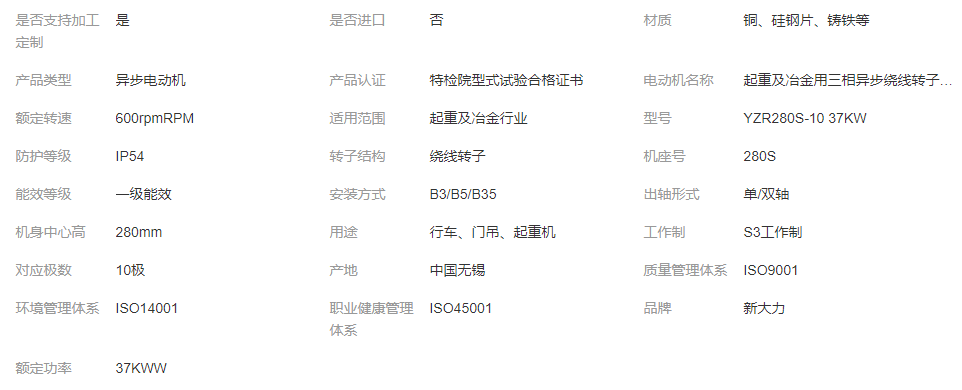 本网页所展示的有关【新大力 起重及冶金用 一级能效 三相异步绕线转子电机 YZR280S-10 37KW_驱动电机_无锡新大力电机有限公司】的信息/图片/参数等由全球零部件网的会员【无锡新大力电机有限公司】提供,由全球零部件网会员【无锡新大力电机有限公司】自行对信息/图片/参数等的真实性、准确性和合法性负责,本平台(本网站)仅提供展示服务,请谨慎交易,因交易而产生的法律关系及法律纠纷由您自行协商解决,本平台(本网站)对此不承担任何责任。您在本网页可以浏览【新大力 起重及冶金用 一级能效 三相异步绕线转子电机 YZR280S-10 37KW_驱动电机_无锡新大力电机有限公司】有关的信息/图片/价格等及提供【新大力 起重及冶金用 一级能效 三相异步绕线转子电机 YZR280S-10 37KW_驱动电机_无锡新大力电机有限公司】的商家公司简介、联系方式等信息。